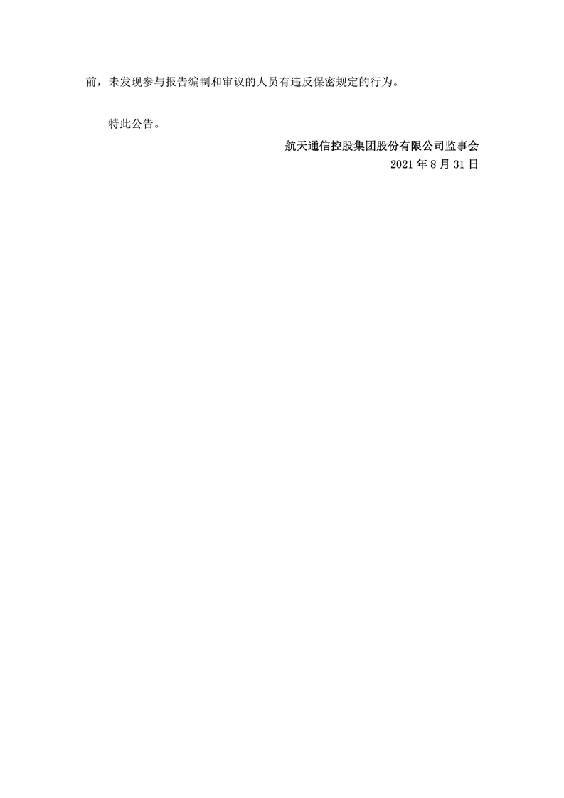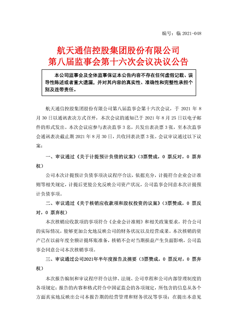 航天通信控股集團股份有限公司八屆十六次監事會決議公告